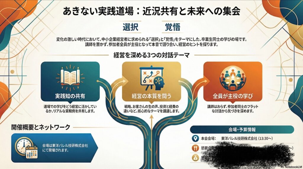 午後からは、経営者仲間との勉強会に参加。参加メンバーは、NNA株式会社さんの「あきない実践道場」の卒業生。誰かが先生になるのではなく、互いの課題や現状を持ち寄り、率直に意見を交わす場です。立場や規模は違っても、同じ中小企業の経営者として悩み、考え、前へ進もうとする仲間がいる。この時間が、自分の視野を広げ、モチベーションを高めてくれます。その後は懇親会。学びと対話の続きは、こうした場から生まれることも少なくありません。