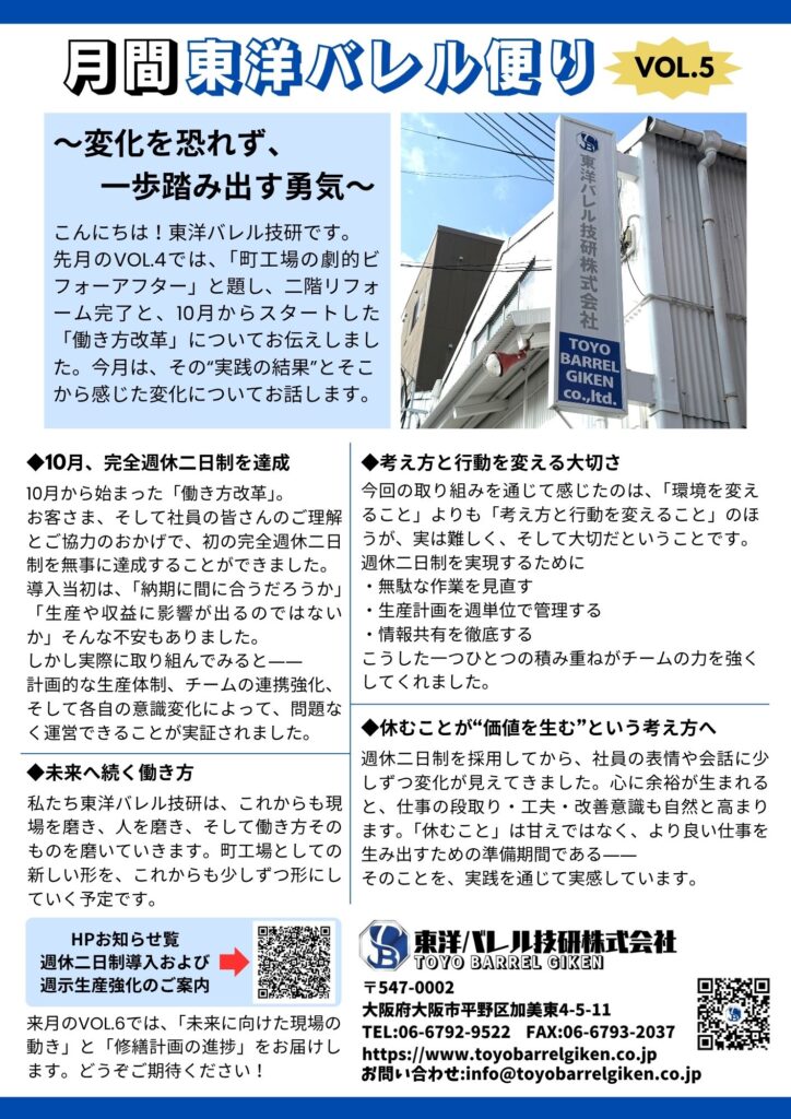 今号では、これまで進めてきた「現場環境の改革」について特集しています。働きやすさ・安全性・効率性の向上を目指し、社員一人ひとりの意見を反映した改善を進行中です。チーム東洋バレルの挑戦は、これからも止まりません。